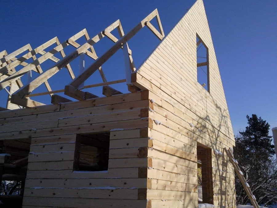 Поверх этой мягкой структуры поперёк стропил закрепляем облицовочные доски и уплощённые балки