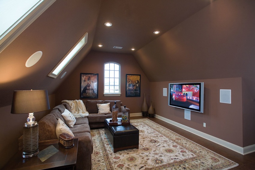 На мансарде можно расположить любое помещение, причем обустроить его можно своими руками. Если верхний этаж получился комфортным и большим, то почему бы там не разместить гостиную? Ее можно использовать для вечернего просмотра фильмов, приема гостей и даже в качестве столовой.