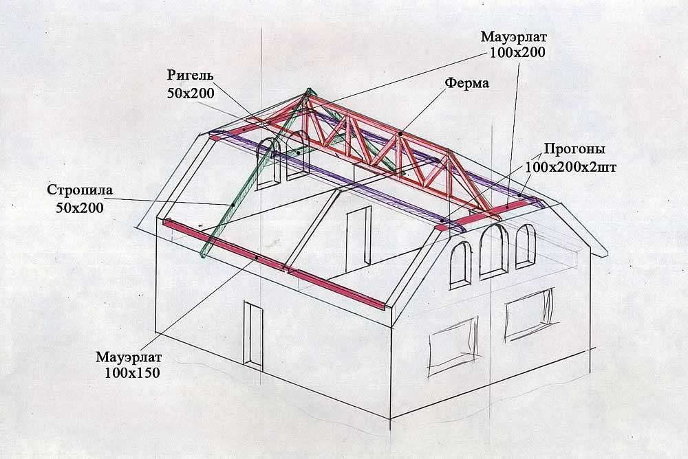 Конструкция стропильной системы состоит из стропил, балок, мауэрлата и конькового бруса. Для конструкции двускатной кровли, к которой предъявляются более серьезные требования по надежности, чертежи дополняются прогонами, подкосами и подпорками.