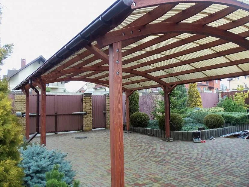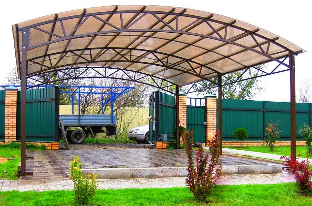 Большей популярностью пользуются арочные навесы (можете видеть их на фото). Они красиво выглядят, у них нет стыков и зазоров, есть два ската, поэтому хорошо скатывается снег и стекает вода.