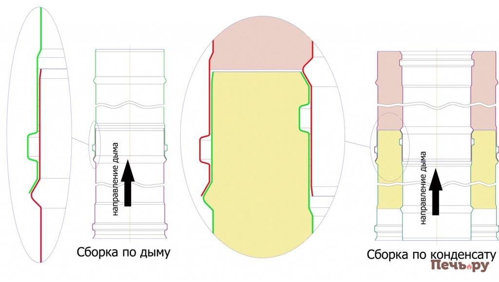 Существует мнение, что собирать по дыму правильнее. Объясняют тем, что на стыках труб остаются щели, куда забиваются выходящие в трубу дымовые газы. В противоположность этому, считается, что если собрать по дыму, то дым перестанет выходить.