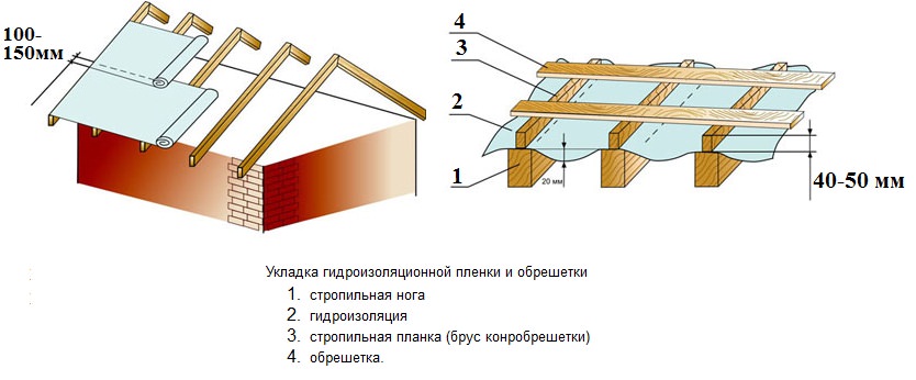 Чтобы покрытие дышало, лучше установить диффузную мембрану с высокой паропроницаемостью. Она позволяет удалять изнутри лишнюю влагу, содержащуюся в воздухе, при этом не пропускает воду. Покрытие производится в рулонах. Над карнизом прибивают две планки, располагая одну над другой, а сверху на них укладывают мембрану. Начинают с водосточного желоба, делая нахлест 10 см