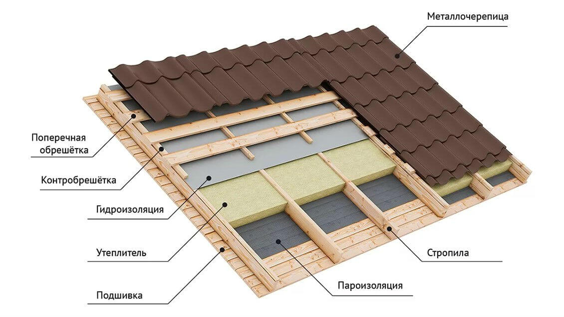 Утеплённая крыша комплектуется несколькими слоями разнообразных материалов. Необходимо обеспечить выход наружу пара из помещения, не допустить протечки воды внутрь дома, создать теплоизоляционный слой, обеспечить этим слоям механическую защиту и сверху, и снизу. Для каждой из этих функций применяется соответствующий материал.