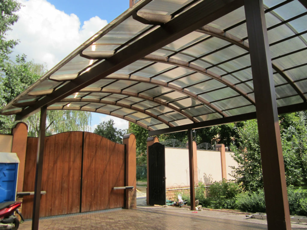 Хороший вид имеет навес для машины из поликарбоната установленный на каркасе из профильной трубы. Этот материал способен без малейшего снижения прочностных характеристик изгибаться. Это его свойство позволяет устанавливать навесы полукруглой формы. Подобные сооружения чрезвычайно легки на вид и превосходно вписываются в стилистику оформления территории двора.