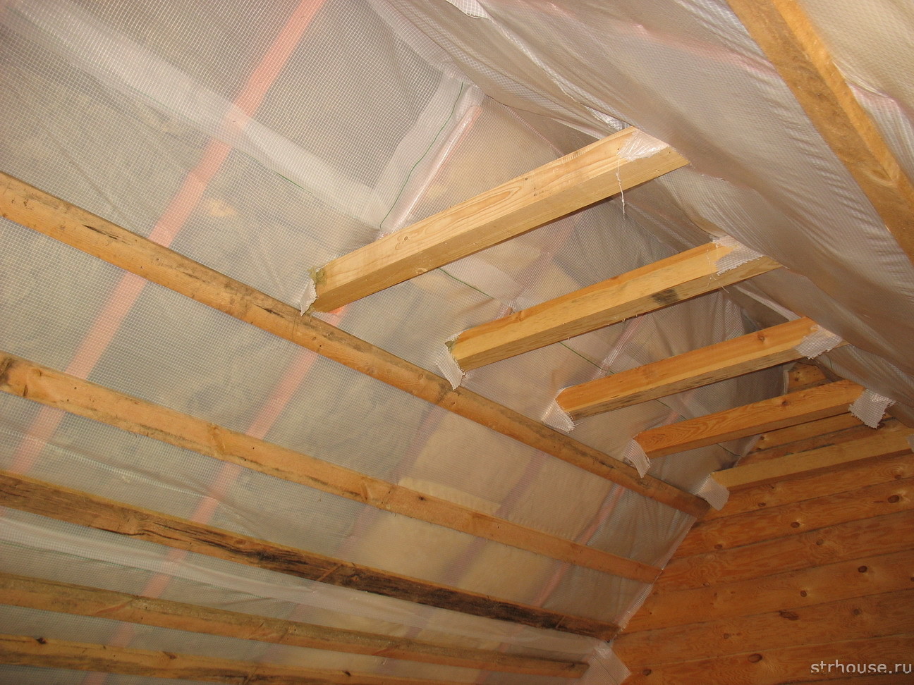Сам утеплитель укладывается очень плотно, нельзя оставлять никаких зазоров и полостей. Поверх минеральной ваты настилается паробарьер, который крепят скобами к деревянной поверхности. Пленка укладывается внахлест, натягивать ее нельзя.