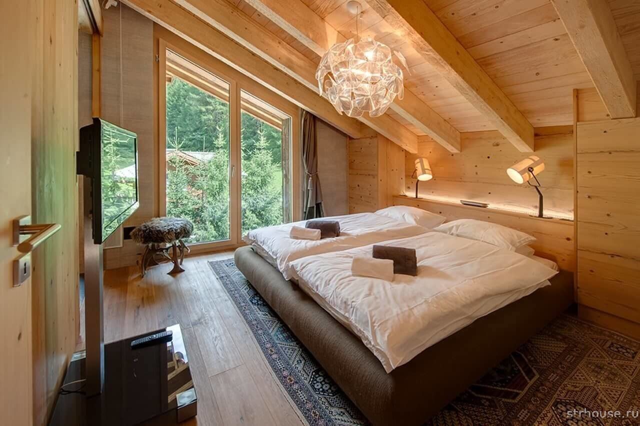 Спальня на мансардном этаже — это стандартный вариант. В этом случае существенную часть помещения займет кровать. Ее можно поставить по центру, изголовьем к одной из стен, если она двуспальная, и сдвинуть вплотную к стене, если односпальная.