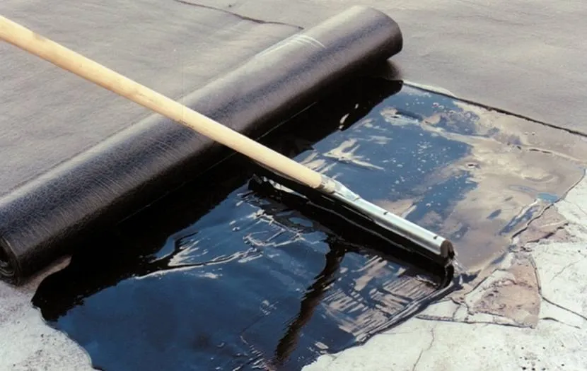 Покрытие выполняется методом наклеивания. Слой мастики наносится на часть поверхности по длине полосы полотна. Каждый рулон рубероида следует расправлять от середины к краям, препятствуя образованию воздушных пузырей. Для избавления от пузырей материал прокалывается, и полотно прижимается к поверхности.