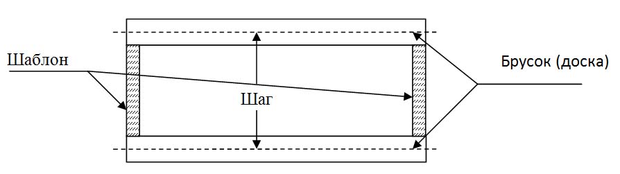 Обрешетку при шаге 450-600 мм допускается выполнять для уклонов крыши более 10°. Для упрощения работы, соблюдения расстояния между брусьями (досками) необходимо изготовить своими руками два шаблона, равных «шагу» за минусом ширины направляющей.