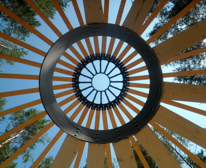 В верхней точке, где сходятся все балки, для надежного крепления используют специальный диск. В это же время осуществляют и обшивку нижних сегментов, что придает конструкции дополнительную устойчивость и прочность. После этого остается лишь установить верхние распорки и обшить каркас древесными плитами.