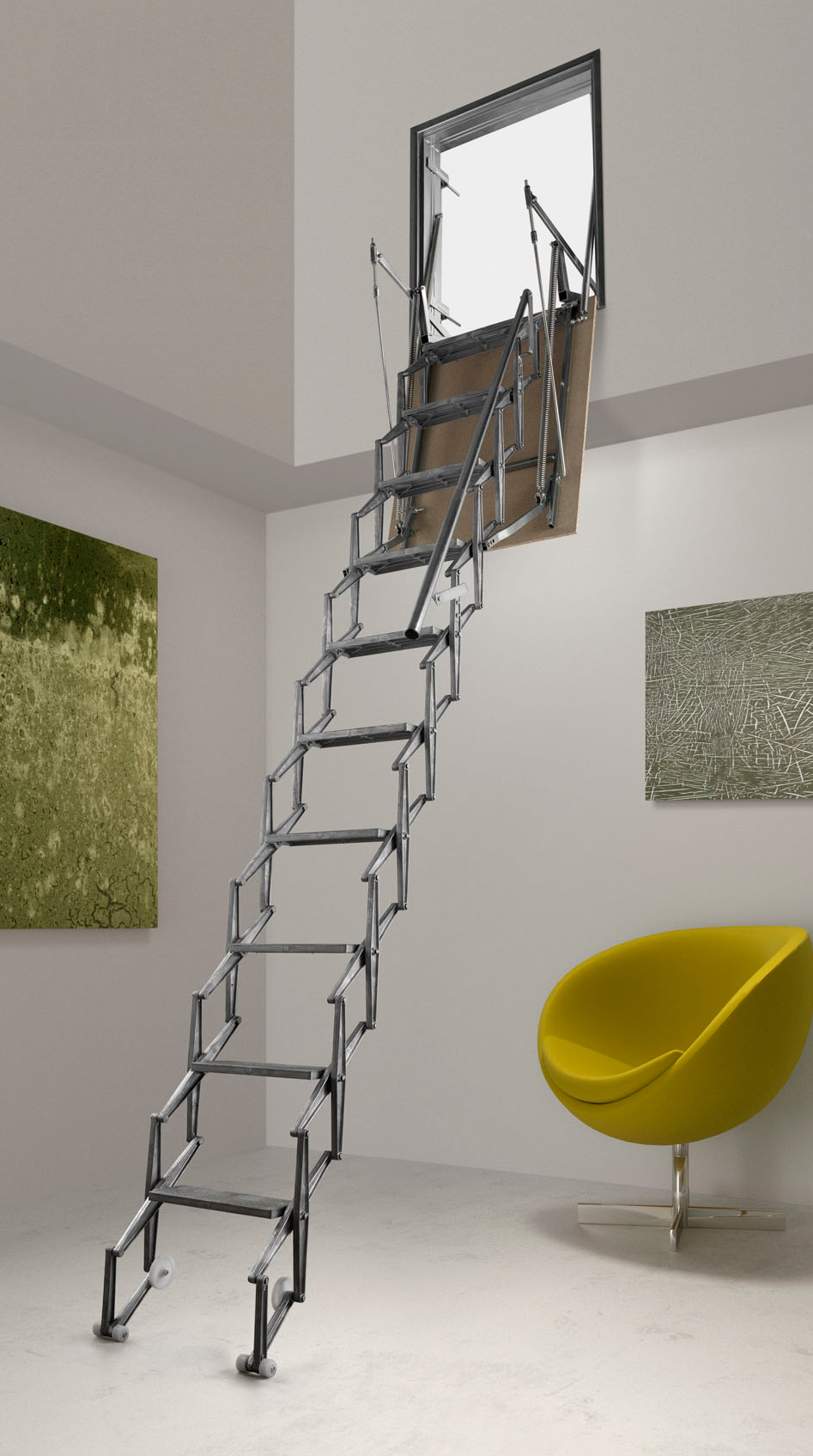 Складные модели можно открывать вручную или автоматически, используя электрический привод. Часто с ручным приводом к механизму прикрепляется груз, что значительно облегчает процесс сборки изделия, он как бы затягивает лестницу в специальную нишу и, наоборот, плавно опускает ее, компенсируя вес.