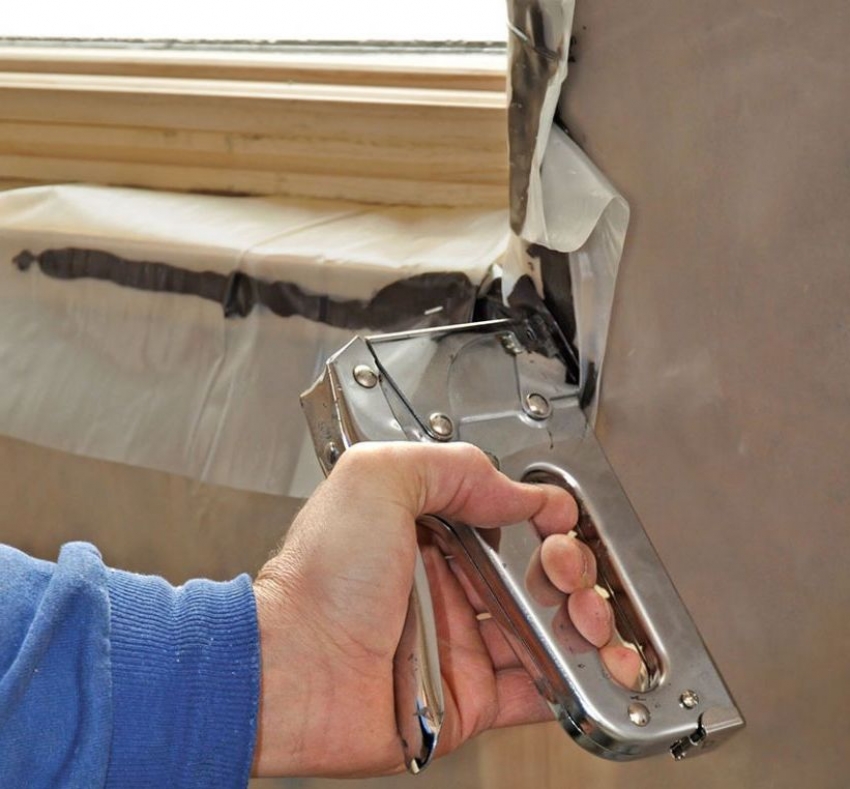 После того как крепеж будет надежно завернут, вокруг рамы потребуется проложить тепло- и гидроизоляционный материал для большей герметичности. Фиксацию гидроизоляционного фартука выполняют с помощью степлера.