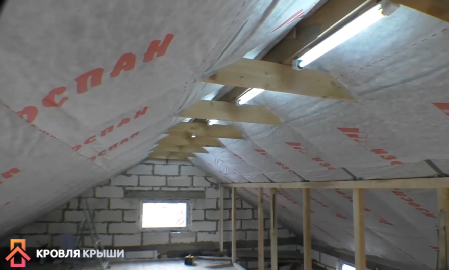 Сначала укладывают гидроизоляционный материал, его крепят при помощи строительного степлера или оцинкованных гвоздей с широкими шляпками. Затем укладывают утеплитель под и между стропилами. Внутренний слой утеплителя укладывают между поперечными брусами, полностью перекрывая стропила. Толщина бруса должна быть равна толщине теплоизоляционного слоя.