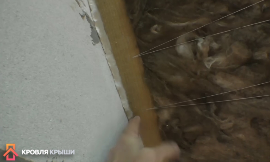 Когда шаг стропильной системы слишком большой, утеплитель дополнительно фиксируется проволокой, которую натягивают между шурупами, вкрученными в стропила