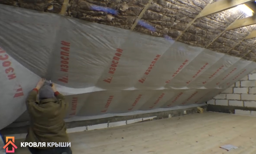 Закончив с укладкой утеплителя, можно приступить к следующему этапу – натяжение и крепеж пароизоляционной пленки или мембраны. К стропильным доскам ее рекомендуют прибивать скобами. Она, в отличие от гидроизоляции, натягивается гораздо плотнее.