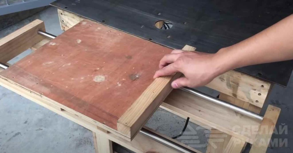 Обычно фрезерный стол используют для обработок продольных краев. Чтобы можно было обработать поперечные торцы, при создании самодельного станка нужно предусмотреть подвижный упор, который перемещается в пазу. Встроенный паз используется и для крепления прижимных устройств.