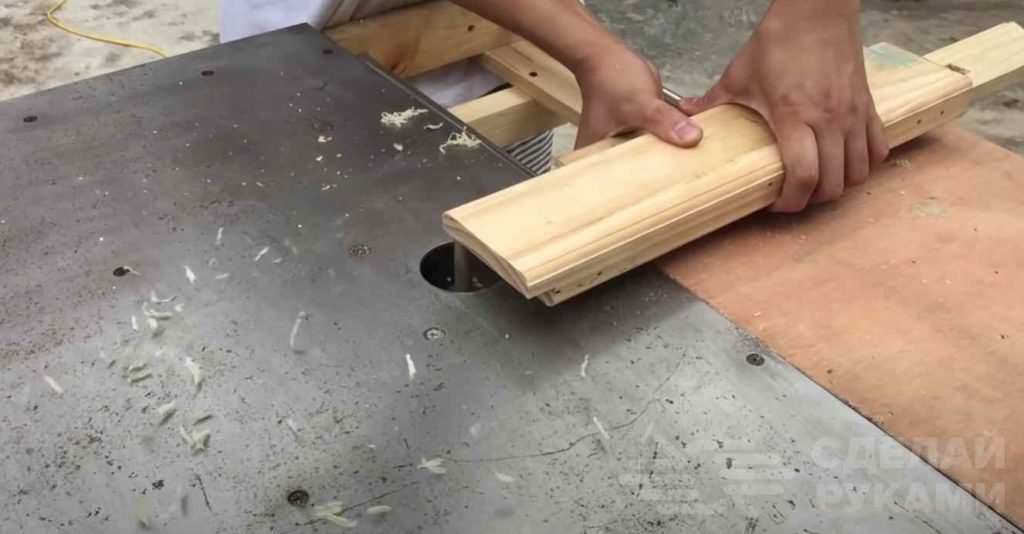 Для ее изготовления понадобится пильный станок, лобзик или ленточная пила. Этим инструментом проходят скосы, достаточно угла в 30 градусов, пропилов в 50 мм. Желательно выполнить скосы с двух сторон прижима.