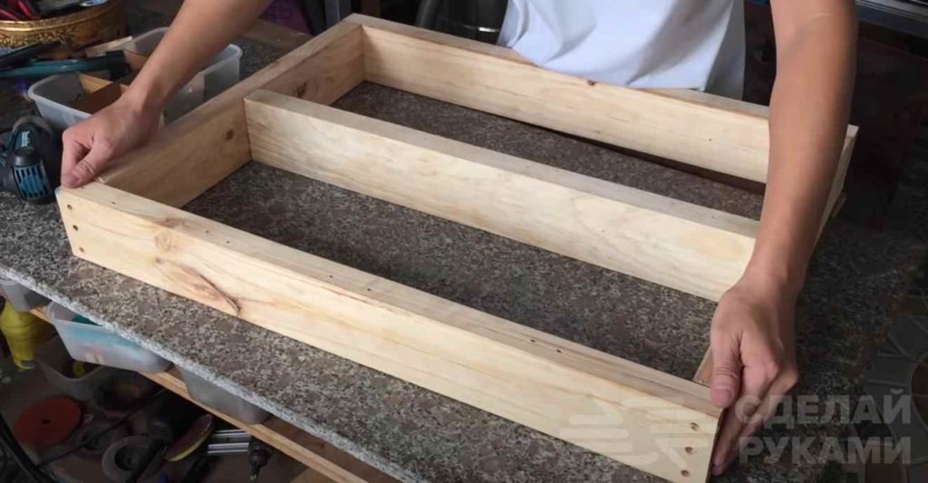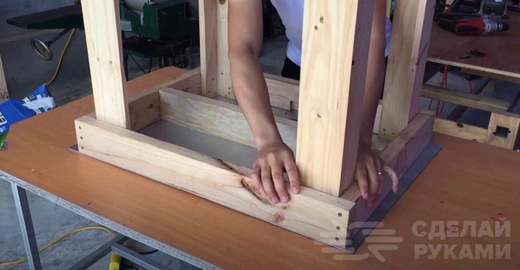 Для устойчивости и жесткости собранной конструкции на низ ножек кладем деревянные планки, делаем обвязку.