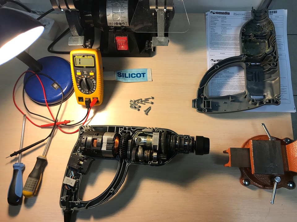 Если всё же операцию выполнить не удаётся, придётся разбирать корпус электродрели для обеспечения доступа к шпинделю.