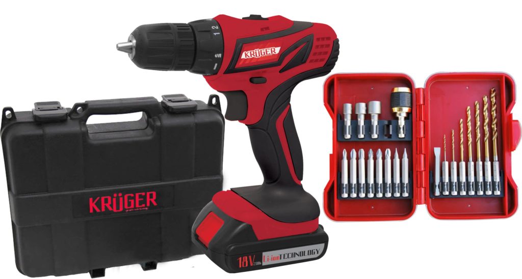 Качественный шуруповерт немецкой компании Kruger, отличатся надежностью и прочностью, позволяет работать как в бытовых условиях, так и на улице. KRÜGER KD-18Li весит 2.1 кг, корпус оборудован подсветкой для удобства работы при плохом освещении. Прорезиненная рукоять модели удобно ложится в руку и сглаживает вибрации, не выскальзывая при работе. В набор включены два элемента питания, чемоданчик для перевозки и хранения, также есть зарядное и инструкция для пользования.