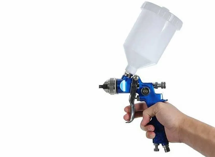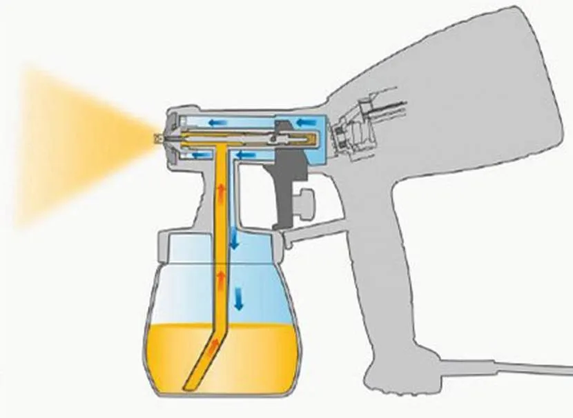 Первое, на что натыкается воздух, попадая в каналы распылителя – это клапан, соединенный с курком. При легком нажатии, путь открывается, поток проходит внутри корпуса и вылетает из воздушной головки. Материал при этом не распыляется, потому что путь ему преграждает конус иглы, упираемый в заднюю стенку дюзы. Более сильное давление на курок отодвигает иглу от сопла, открывая краске проход, проходя по которому она подхватывается потоком воздуха и стремительно вырывается вперед облаком мелких частиц. Если бак установлен снизу (как у большинства электрических моделей), смесь вытесняется через трубку тем-же воздухом, попадающим в емкость через второе, открытое для него отверстие. По этому принципу можно изготовить вполне приличный самодельный краскопульт для покраски авто без компрессора, на основе старого бытового пылесоса.