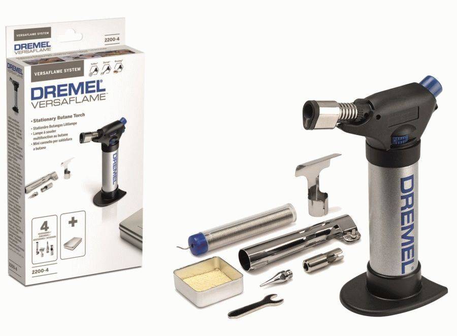 Бесконтактный газовый паяльник Dremel VersaTip. Удобный, легкий, он универсален и может выполнять функции паяльника, газовой горелки, горячего ножа и фена. Время работы на минимальной мощности составляет 90 минут, а на максимальной – 30 минут. Разогрев происходит быстро, его максимальная температура плавно регулируется, и составляет в своем максимуме 1200 градусов. В комплект входит 6 насадок, а цена прибора от 2545 до 3199 руб.
